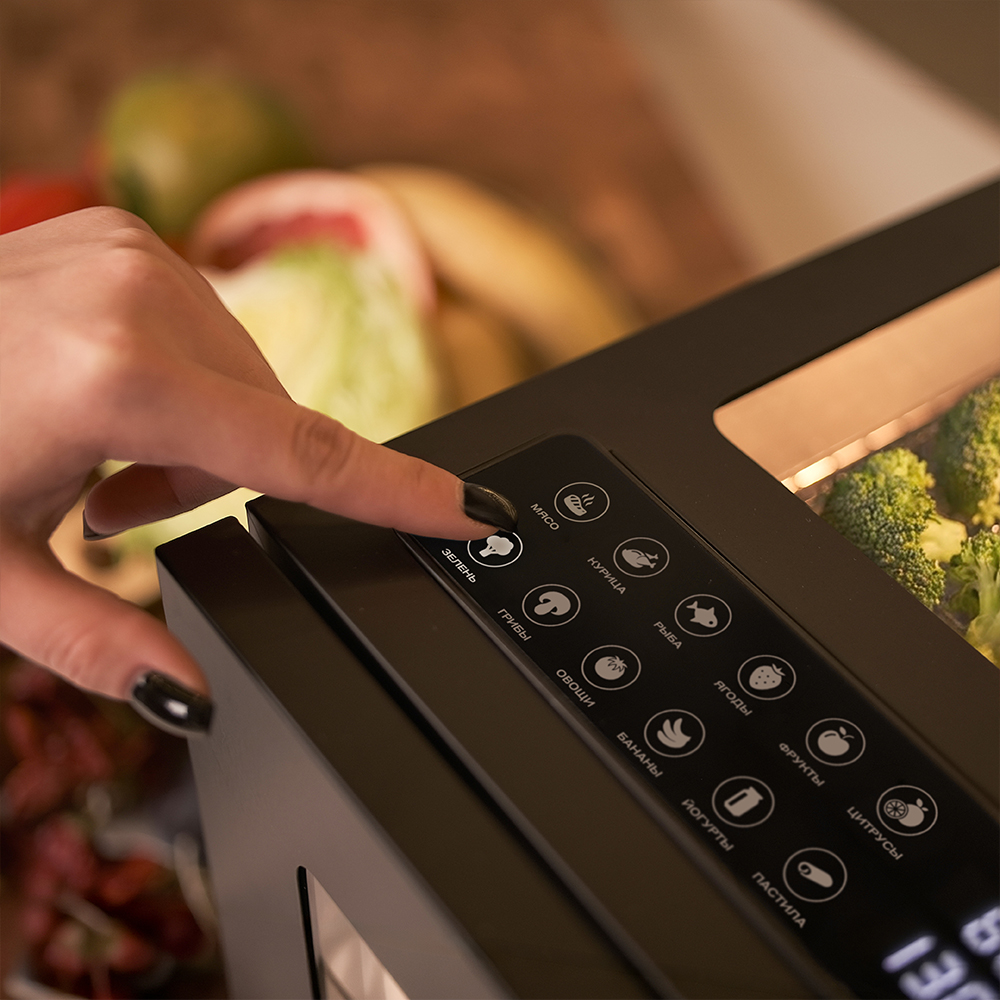 Дегидратор оснащён сенсорной панелью, которая значительно упрощает процесс настройки. Никаких механических рычагов и лишних кнопок — всё управление сосредоточено в одном месте.