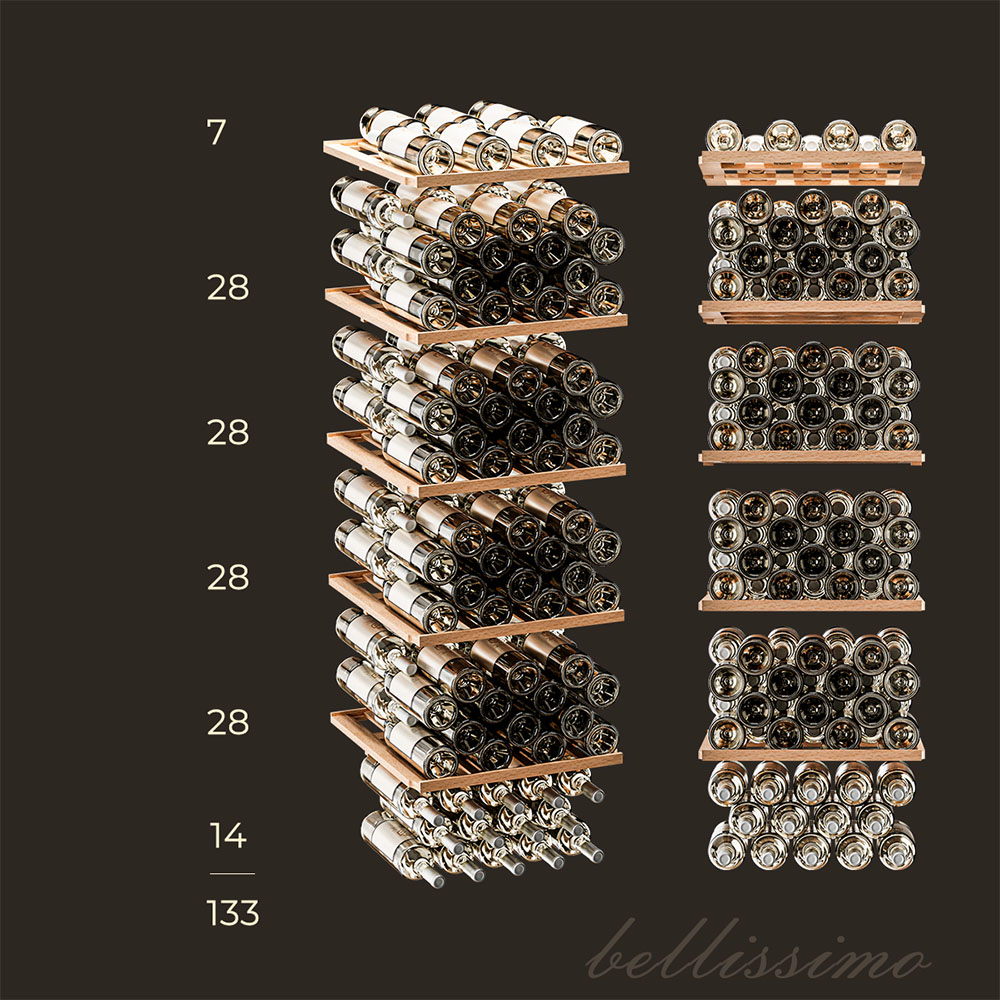 Модель оснащена пятью полками из дерева, что не только выглядит стильно, но и способствует правильной циркуляции воздуха внутри шкафа. Дополнительно можно установить до 8 полок, а также приобрести демонстрационную полку и полку для фужеров. Тройное стекло с УФ-фильтром надежно защищает вино от вредного воздействия света, что сохраняет его уникальный вкус и аромат.