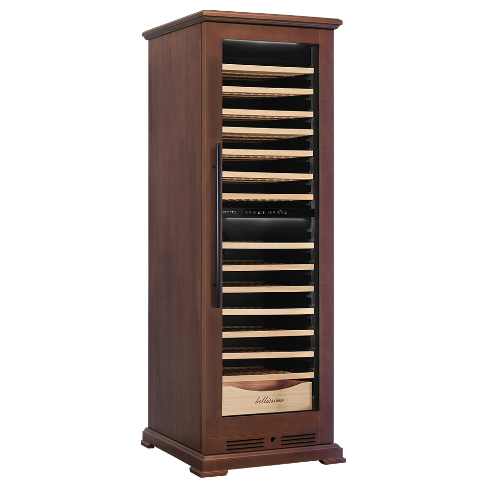 Винный шкаф предназначен для профессионального и длительного хранения различных сортов вин (до 174 бутылок типа Бордо). Он так же оснащен дверью с защитой от ультрафиолетовых лучей и поддерживает влажность в диапазоне 60-80%, как в настоящем винном погребе. Стальной корпус обшит натуральным буком, который выдерживает большие нагрузки и обладает красивой текстурой.