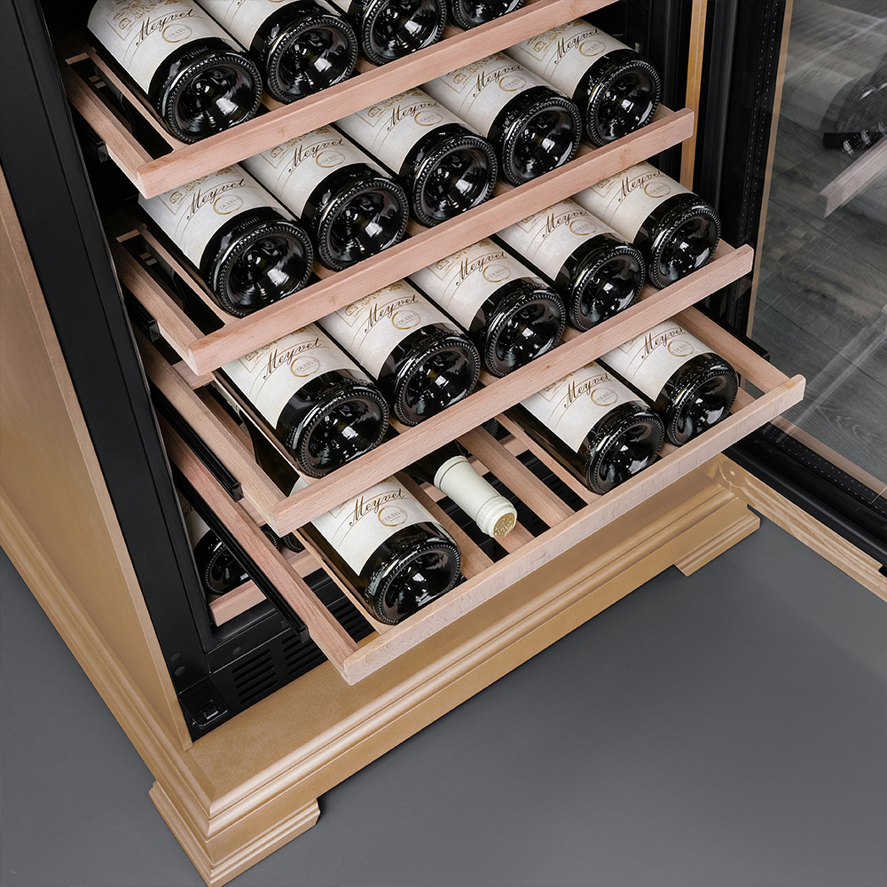 Полки выполнены из массива бука. Этот натуральный и крепкий материал не только имеет красивую текстуру, но и прекрасно гасит небольшую вибрацию. Так что Ваше вино будет храниться в абсолютном покое.