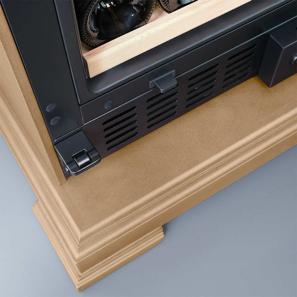 Винный холодильник оснащён надёжным и экономичным компрессором. Есть ручка, вентиляционная решётка и замок.