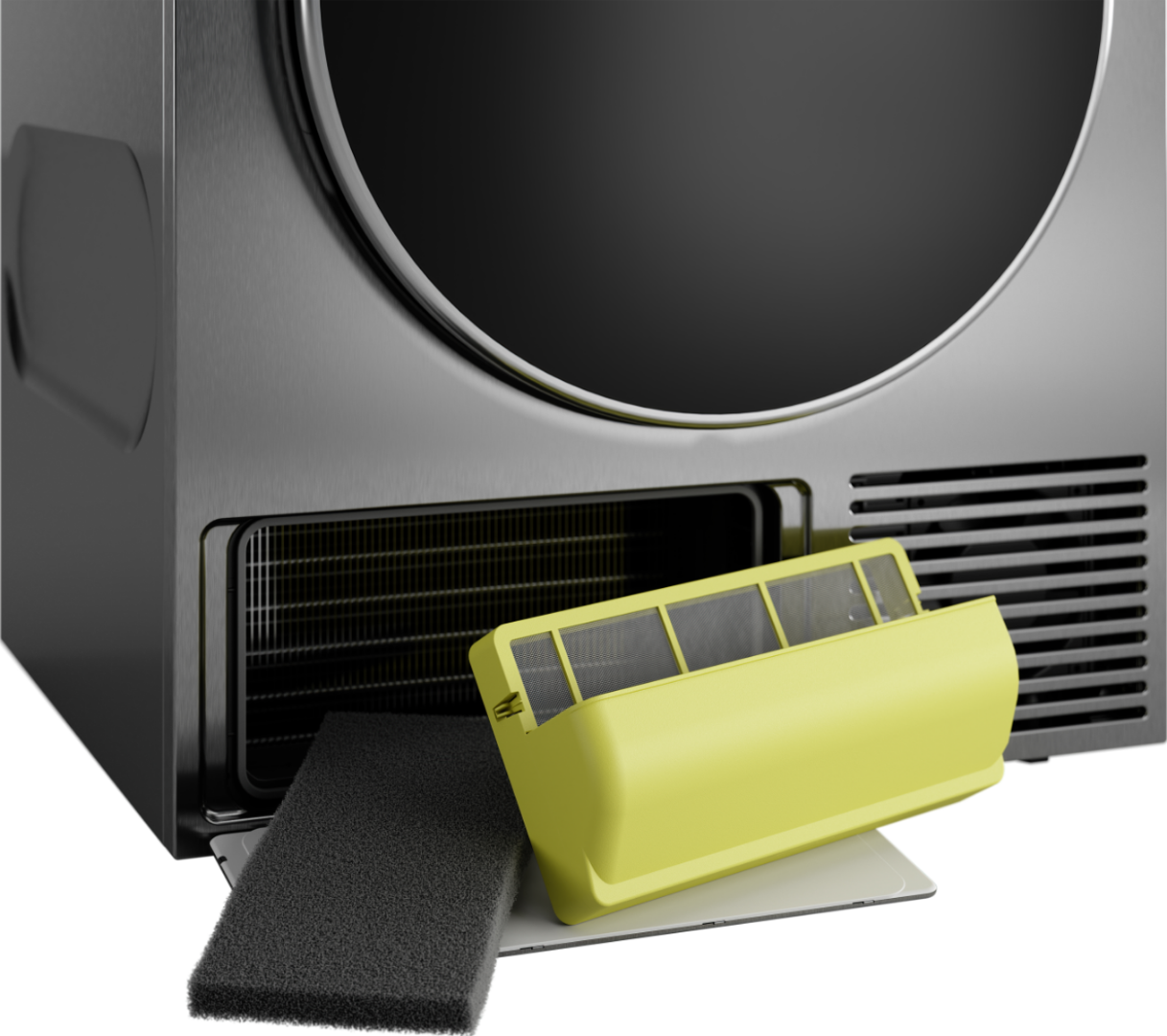 Дверной фильтр с легкой очисткой. Эффективный уловитель ворса, который предотвращает попадание ворсинок и пыли на более чувствительные и трудно очищаемые конденсатор и вентилятор: легко промывается промывочной водой или просто протирается рукой; легкое открытие дверного фильтра; байонетное и винтовое крепление рамки фильтра; индикация очистки ворсового фильтра в качестве напоминания на дисплее.